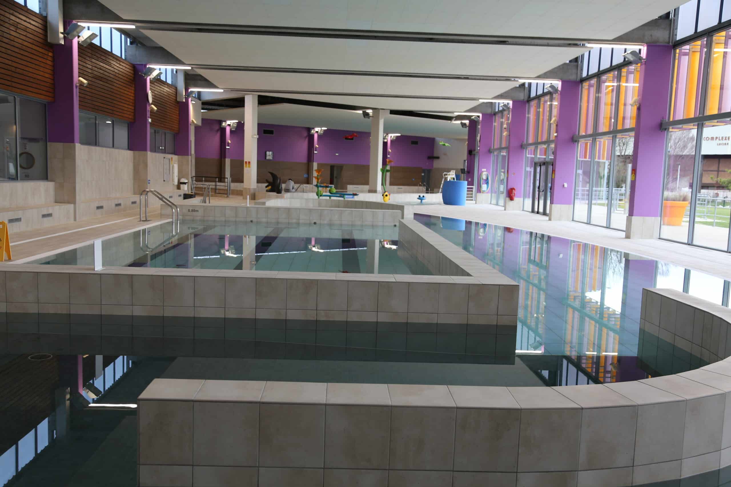 • Un bassin ludique de 215 m2 comprenant une banquette à bulles, des jets massants, une rivière à contre-courant et un espace dapprentissage de 3 lignes de 12,50 m ;